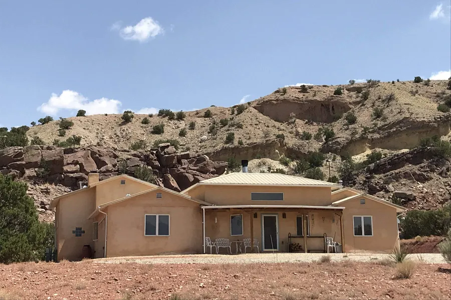 Quintessential New Mexico Hacienda on nearly 10 Acres with panoramic views of the Sandia & Jemez Mountains. This off-grid property has multiple buildings: furnished 2300+/-SF custom home, 450+/- SF yurt, 360+/- studio bldg. & 600 +/- SF steel pole shed w/roll up doors. The adobe style main home consists of 2 BR, 2.5 BA + office/library & is filled with natural light & 14’ high ceilings w/exposed wooden beams. The great room has a custom highly efficient fireplace & French doors leading to a central courtyard.The kitchen has a wood fired oven & large island. The master bedroom suite has a custom fireplace & large walk-in closet.Multiple PV systems partner w/wind turbine. Reliable water system includes a deep well & storage tank. Off grid and located off a county maintained road with a gated driveway.