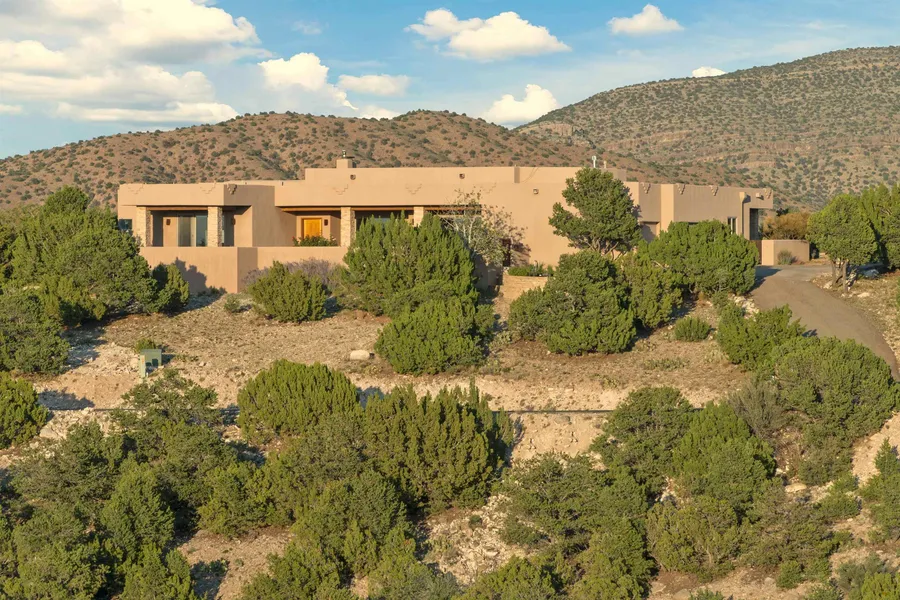 This custom built home on a premiere lot in The Overlook has 360 views from Sandias to Rio Grand Valley. Contemporary, Frank Lloyd Wright influenced, Single Level home, exudes warmth and sophistication. Main house: Open concept floor plan, 2 master bedrooms en-suites, one w/ soaking tub and walk-in shower with adaptive devices. Library/Office in largest master suite. Thoughtful blend of Italian marble, travertine stone, blond hardwood floors and carpeting. High Ceiling's. Masterful Anasazi stacked stonework walls, columns and fireplace. Attached Guest House: 2 bedrooms, 2 baths w/walk-in showers and shared living area. Two Enclosed yards. Five covered patios. Outdoor fireplace. Refrigerated air conditioning and forced gas heat HVAC. High-end finishes and appliances. Landscaped with roses, lavender, grasses and pinion trees. Frank Lloyd Wright elements include iconic hearth and fireplace, FLW metal lattice pattern filters afternoon light through clerestory windows, FLW stained glass windows, cabinet trim and garden gates. Kitchen designed for ease and entertaining. Absolute black granite counters, large island w/storage. Pantry. Dacor 6 burner gas range w/Dbl. electric oven. 3 car garage has direct entry. UPDATES: NEW STUCCO, electronic water filtration and softener system, granite counter top, partial membrane roof, hot water circulator. Text 505-699-9866 to see! Serenity, sunsets, mountain views and wild horses!