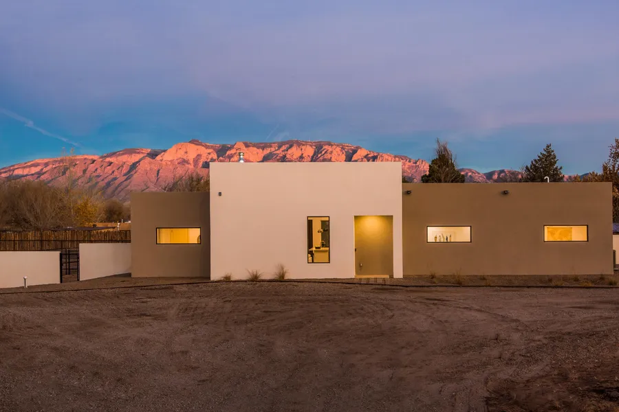 Sophisticated contemporary newly built home that embodies the charm and peacefulness of Corrales living is now available. Situated in the heart of the Corrales greenbelt, this home offers a flexible floorplan and a beautifully sited lot to take advantage of the mountain views. There is room for horses, gardens, and space to enjoy the views. Quartz countertops throughout, soft close cabinets, commercial grade TPO roof, high efficiency insulation, energy efficient Pella wood aluminum clad windows with advanced Low-E Insulating glass, Ambiance Elegance 36 wood burning fireplace with 75% optimal efficiency,front yard landscaping offers gravel and all native/ low water use plants and trees with drip irrigation (timer) for easy care and maintenance, and polished concrete floors throughout.