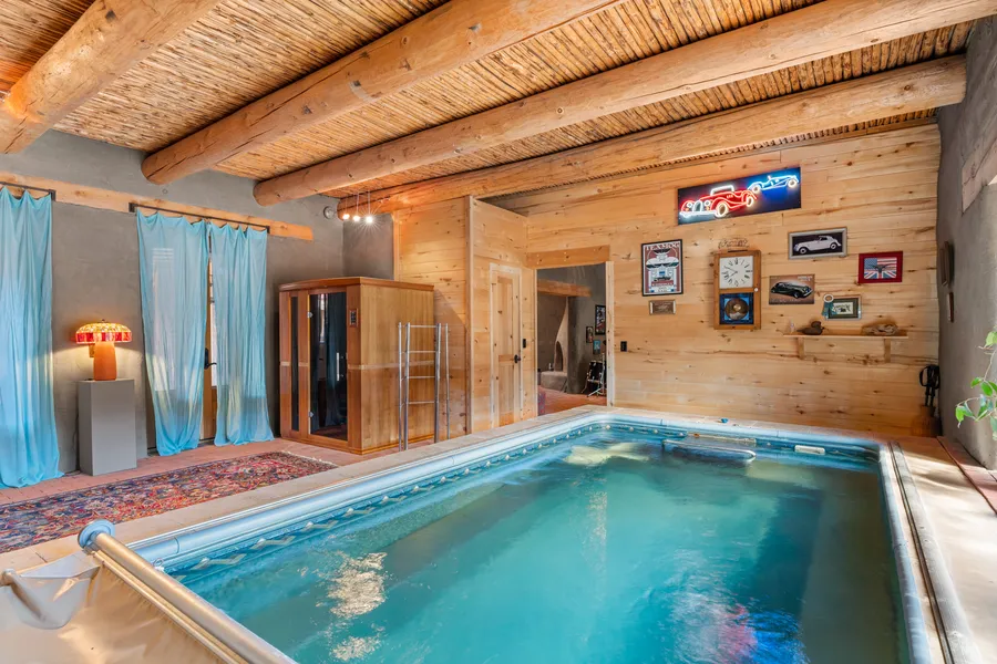 Just 50 miles north of Albuquerque, near the charming town of Cuba, NM, this exceptional private retreat offers the opportunity for peaceful luxurious living. Set upon 7 acres of serene landscape, this magnificent compound boasts a spacious pueblo-style hacienda home, a guest house, and a detached 7-car garage, all enveloped in the quiet embrace of nature. Crafted with meticulous attention to detail, the Green-Build certified residence exudes elegance and comfort at every turn. Constructed with traditional adobe walls, the home maintains a timeless charm while offering modern amenities for today's discerning homeowner. With double-walled adobe construction, 2'' insulation, and elastomeric stucco, the residence ensures unparalleled energy efficiency and tranquility, creating a sanctuary of peace and serenity. Inside, the main house spans 5000 sq ft and features 10'-12' ceilings adorned with vigas and latillas, natural earthen plaster walls, and radiant floor heating for ultimate comfort. The home's thoughtful design includes a wealth of high-quality touches, from the maroon enamel LaCanche gas range to the oversized pantry and custom travertine sink. Entertainment abounds with a 22'x16' enclosed theater, complete with a 6.5'x12' screen and a state-of-the-art projector, offering the perfect space for movie nights with friends and family. For relaxation, indulge in the 5000 sq/ft indoor pool or unwind in the dynamic 3-person infrared sauna. Outside, the property features a 576 sq/ft workshop, a guest house with a kitchenette and 3/4 bath, and ample space for gardening or equestrian pursuits. A concrete driveway, secured by a double opening steel entry gate, ensures privacy and security for residents. With its prime location, impeccable craftsmanship, and abundant amenities, this remarkable compound offers a rare opportunity to embrace the quintessential New Mexico lifestyle. With negotiable furnishings, don't miss your chance to make this exquisite retreat your own.