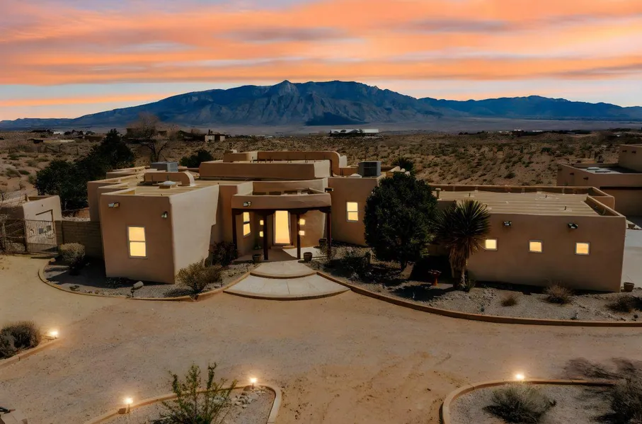 Discover your own oasis in Rio Rancho Estates, where luxury meets functionality in this stunning Pueblo-style residence. This exquisite 3-bedroom home offers the potential for a fourth bedroom or office/nursery, ideal for modern lifestyles. With lofty ceilings, large windows, and skylights, Natural light floods the spacious interior. The vast outdoor living space features a private heated pool and year-round heated hot tub with breathtaking mountain views, perfect for both relaxation and entertainment. 2 fenced acres with automatic gate, this property also includes a 3-vehicle oversized garage/workshop, along with 1965 square feet of enclosed RV/Boat/Toy storage equipped with 50 Amp service. Zoned E1, Horses are welcome. A true retreat for those who cherish open spaces.