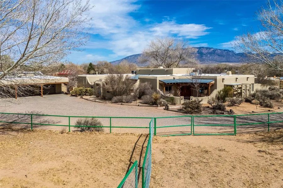 Corrales Adobe Compound on 3+ acres! Fabulous updated adobe w/sep 1 BR adobe guest house, inground pool, and exceptional horse facitlites. Sits in a private convienant southen location that holds the Sandia mountains as a backdrop. Gated entry to this incrediable horse property. Enter into the large courtyard w/fountain. A dramaticentry to the greatroom & dining w/a custom Al Knight fireplace. Gorgeous remodeled kitchen w/island, pantry, breakfast nook, Bosh SS appliances, Thermador cooktop, & Hickory cabinets. Service room, 3/4 bath access to garage & guest house. Primary BR w/kiva FP, sitting area & remodeled bath. 2BR w/onsuite, 3BR or office. Vigas, high ceilings, brickfloors a true SW adobe! Custom pool w/hot tub & waterfalls inside a large inviting east courtyard. Excellent equestrian facilities. 6 stall barn w/tack 3/4 bath, sep.septic, arena, turnouts. Yes, this can be your dream come true.
