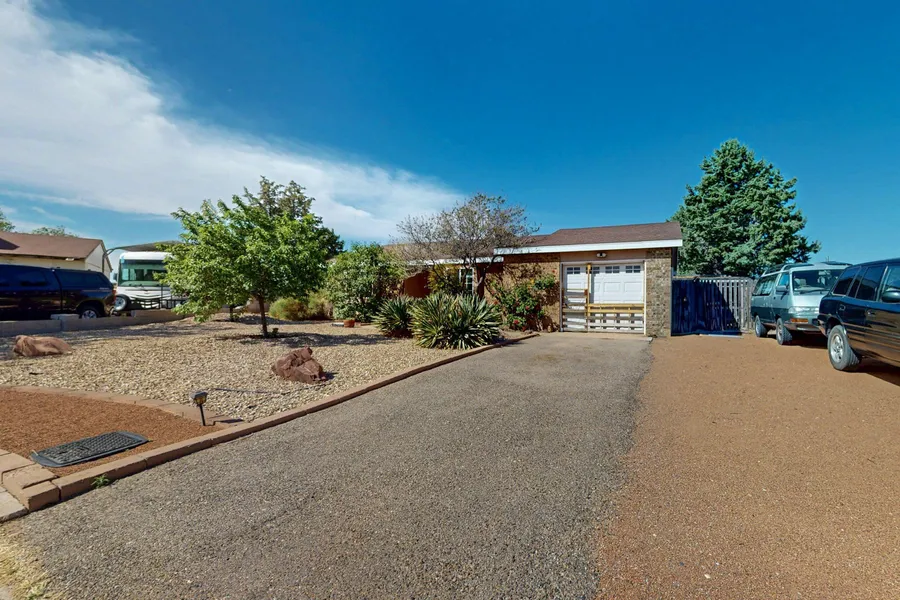 Price reduced on this move in ready home tucked away in a peaceful cul-de-sac! Open, bright floor plan with vaulted ceiling in the great room, 3 bedrooms, 2 bathrooms and ceiling fans throughout. Beautiful windows with deep ledges for plants, art, collections or anything you desire. Enjoy the large primary suite with a sitting area and a large soaking tub with dual shower heads. Great kitchen with gas stove and plenty of shelves and big pantry for storage. Beautifully landscaped backyard that attracts the amazing birds of New Mexico to enjoy while relaxing under the shaded patio. Large bonus outdoor building with so many possibilities from hobby room to a corral for the animal lover! Location!!! Close to everything from open space, parks, public swimming pool, shopping & hospitals!