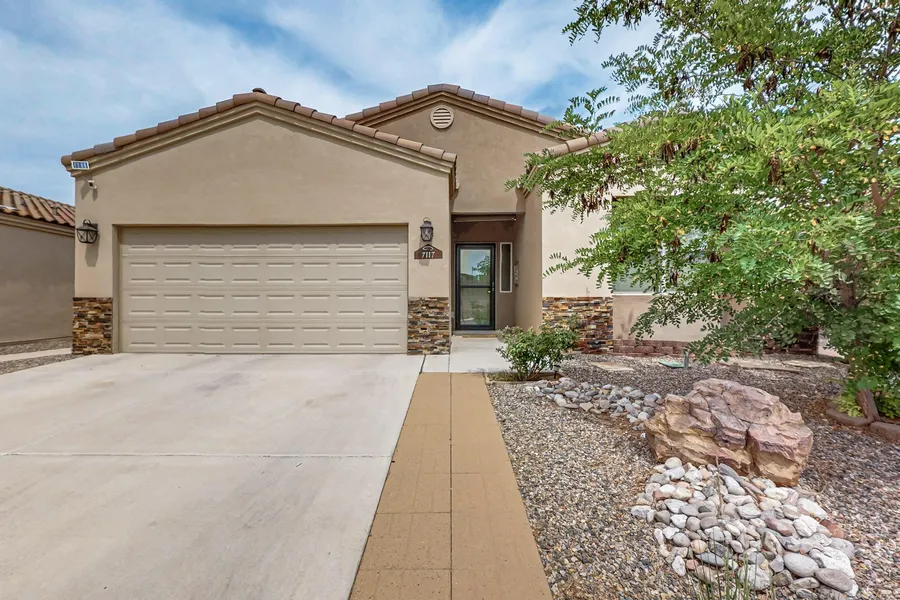 Enjoy a beautifully landscaped backyard with stunning views of the Sandia Mountains! This home features a spacious open layout, perfect for entertaining. The kitchen offers granite countertops, upgraded cabinetry, a stylish backsplash, stainless steel appliances including a double oven, refrigerator, pantry, breakfast bar, and extra storage. The owner's suite is separate from guest rooms and includes a private bath with dual sinks, a garden tub, walk-in shower, and walk-in closet. Guest bedrooms feature built-in storage shelves. Additional highlights include a water softener, covered and extended patio, and a spacious garage.