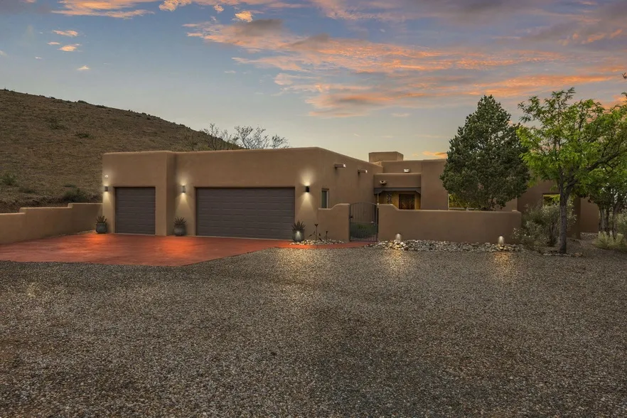 Welcome to a stunning Southwest-style home offering the perfect blend of elegance and warmth. This home is perfectly placed on 1.47 acre lot in Sundance Mesa Subdivision in Placitas! Warm earth tones complement vigas, beams, and beautiful travertine flooring. The kitchen is truly the heart of this home, placed in the center of the floor plan. Complete with custom alder cabinets, cafe appliances, granite countertops, travertine backsplash, and an island with counter seating. The living room has a cozy kiva fireplace and built-in shelving. Unwind in the spacious primary suite, a sanctuary designed for relaxation and rejuvenation. The ensuite bathroom features a double vanity, a luxurious walk-in shower, and a jetted tub where you can indulge in moments of tranquility.