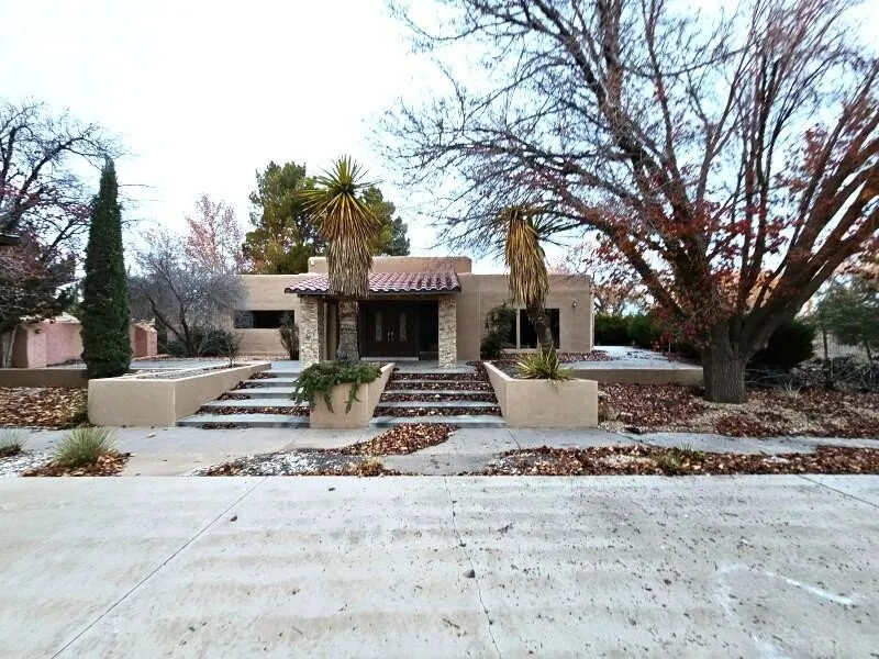 Located behind secured gates on 2.51 acres, this contemporary property offers privacy and close proximity to the Corrales Bosque and the Rio Grande River. The entry atrium includes an indoor garden and a large skylight providing natural light to the space. The main living area features a built-in bar and a wood-beamed ceiling crafted with beautiful custom detail. The kitchen includes custom cabinetry and countertops, a commercial-grade range, oversized pantry island with seating area and additional modern finishes. The owner's suite includes a fireplace and a bathroom with dual sinks a freestanding tub integrated with the shower area, and an amazing walk-in closet. Detached casita with 2 bedrooms and 2 bathrooms and not to mention a pool - (pool needs work). This home is a must see!