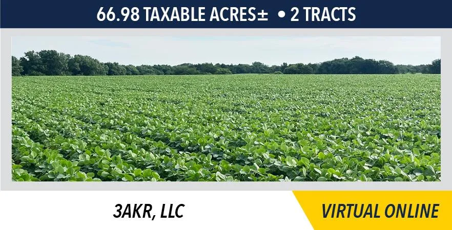 The 3AKR, LLC farm will be sold on a price per acre basis, based on taxable acres. Both tracts will be offered through the marketing method of Buyers Choice, whereas the high bidder can elect either or both tract(s) for their high bid. If the high bidder does not elect both offered tracts, then the remaining tract will be offered. The tracts will NOT be offered in their entirety at the conclusion of the auction.