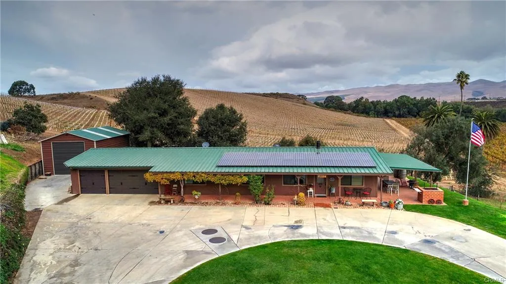 Have you imagined looking down on green pastures, being self-sufficient and away from the crowds, yet only be 10 minutes from town? Stop imagining and make your dreams reality. At the end of the Foxen Canyon Wine Trail is this absolute stunner of a ranchette! Perched with a commanding view of 7 acres is a 1575 square foot ranch style home accented with a circular driveway. This amazing property has been maintained with a white glove in an extremely meticulous fashion. The custom home is warm, inviting and features wood floors and accents, vineyard views, a fireplace, large bedrooms and a 3 car garage! Entertain your guests from your outside patio and BBQ area overlooking your spread. Listing the amenities of this property do not do it justice, but they include: A 20' by 30' custom work shop with a car lift that would be the envy of any mechanic or auto enthusiast! A separate 20' x 35' RV barn will house all of your recreational toys. Nearly 4 acres of lush irrigated pastures, with multiple paddocks are adjoined by a pipe style constructed 4 stall horse barn, hay barn, tack-room and a fully lighted arena. Turn key ready for horse trainers, family 4H projects, or any livestock/hobby ranch endeavor. Solar systems provide all your domestic and irrigation power needs from 2 wells at virtually no cost. Don't let this location fool you, nestled on the hill with gorgeous valley and vineyard views, your micro-climate oasis is only minutes from town! This a one of a kind property.
