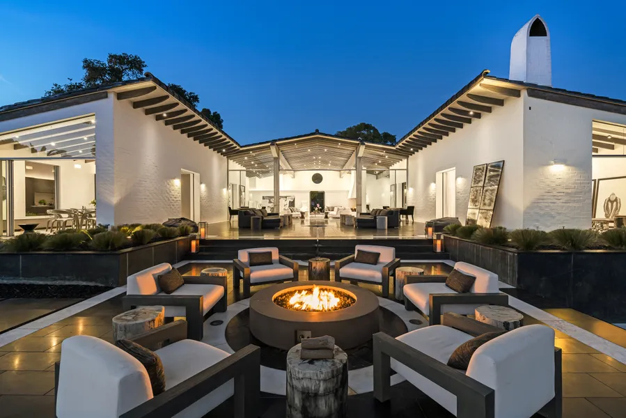 Tucked away behind grand gates, the serenity of the home is emphasized by the privacy and tranquility of its lushly landscaped over 1.3-acre lot. Featuring a sprawling lawn up to the cliff's edge and a majestic oak tree. Vaulted beamed ceilings highlight the central living room which features an original Wallace Neff fireplace and African blue marble flooring. Large primary suite commands the left wing of the home and includes dual en-suite bathrooms with contrasting themes and a private lounge.