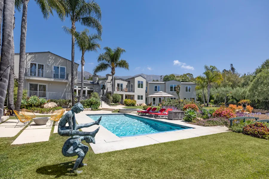 Dramatic clean lines, as formal or casual as you wish, this chic, "Modern" 6,168 square foot estate is set in a prime location with exceptional privacy on 1.3 amazing level acres in the very heart of Montecito, very short distance to Montecito Union Elementary School, Manning Park, Montecito Y, Upper Village and beyond to Miramar Beach and The Rosewood. Southern exposure, high ceilings, floor-to-ceiling windows and doors blend interiors with a magnificent lush outdoor environment; open, interior spaces invite art, sculpture, artifacts. An excellent floorplan, thoughtfully expanded by the current owner, features a contemporary great room as its hub, with two separate, flexible wings for family, guests, offices, and home entertainment. The serene courtyard entry with Zen fountain leads to a formal living/dining room, warming fireplace and French doors to beautiful gardens. The primary bedroom on the second level features a dedicated balcony overlooking the south garden, luxurious adjacent bath, and expansive walk-in closet. There are six bedrooms, five baths in the main residence, media room, plus two additional large bonus rooms: one suitable as an office suite with deck and garden views, the other currently a playroom that could inspire a dance, art or exercise studio. A spacious deck off the great room leads to a sparkling pool, spa, plus a 715 sq. ft. pool house enclosed with multi-fold glass doors, full sixth bath, and sauna. Magical gardens are graced by oaks, olives, seasonal rock-lined stream with stone bridge, bamboo meditation forest, fruit orchard, and rose garden...your Eden. For the young and young-at-heart, a wonderland: climbing structure, sports court, tree swings, and putting green; there is even an outdoor shower for beach sand and a wash station for Fido! An 831 square foot two-car garage plus third bay "sports" garage and exceptional outdoor space in the gated motor court provide excellent parking. Truly a safe havenwith all the fun of Montecito just beyond the gates!