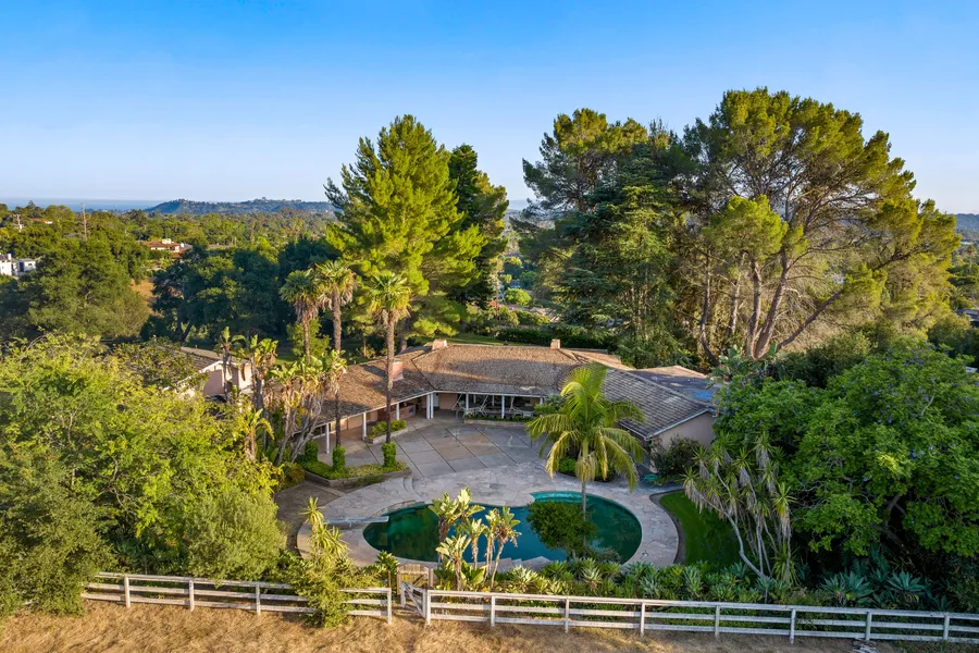 Mid Century Circa 1952 by Howell & Arendt. Sprawling Single Level Ranch on 5.65 Acres. Nestled up a Private Drive in a Resort Style Setting Offering Dramatic Mountain & Ocean Views Overlooking Campanil Hills. An Ideal Floor Plan for Indoor Outdoor Living & Entertaining. Primary Suite Opens to The Pool Area and Gardens. The Gracious Living Room with Walls of Glass, Cathedral Ceilings & Accent Lighting Enjoys both Northerly and Southerly Views. There is a Frank Sinatra Style Party Room with Hidden Bar Mid Century Fireplace & Terrazzo Flooring. This Versatile Property Offers a Detached Office, Tack Room & Horse Corral. Live the Santa Barbara Dream at Rancho Manana.