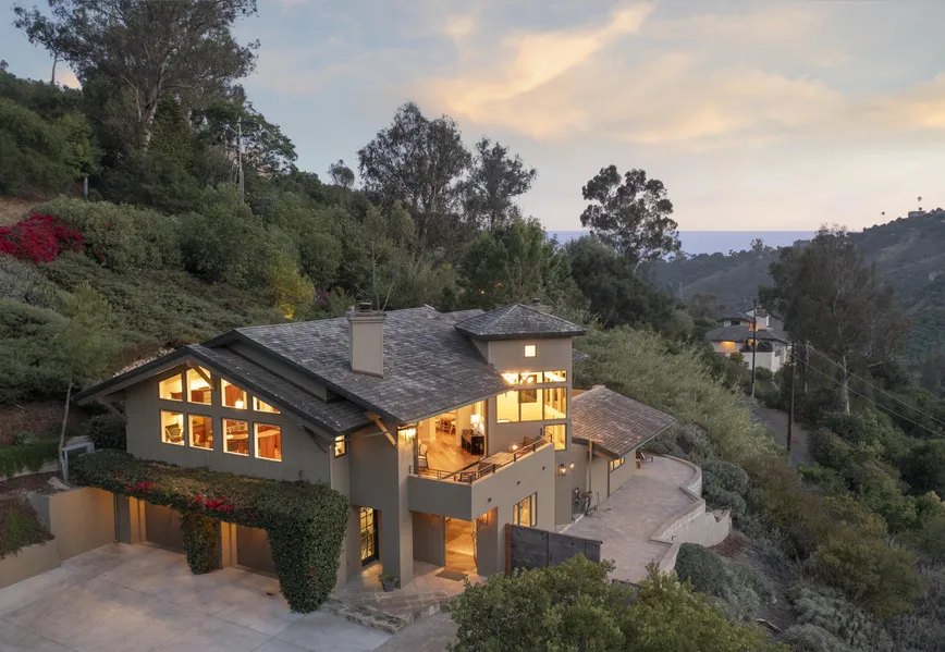 Situated above Sycamore Canyon on Montecito's western edge, 62 Canon View is a stunning contemporary retreat that offers privacy, quality, and breathtaking mountain and canyon views. Located in the Eucalyptus Knolls community and within the award-winning Cold Springs School District, this gorgeous four bedroom, three- and one-half bath home on a private one-acre parcel provides a serene sanctuary just minutes from both Coast Village Road and Downtown Santa Barbara. Quality construction is evident from the moment one passes through the large custom copper front door. Views abound from nearly every room, deck, and patio. The open floor plan seamlessly integrates the main living areas, including the kitchen, dining, and living rooms, all of which feature soaring ceilings and hardwood floors. A cozy fireplace anchors the living room, and a dramatic six-panel bi-fold glass wall perfectly frames the stunning view of Cathedral Peak. The luxurious primary suite is a private retreat, complete with its own view deck, fireplace, vaulted ceilings, multiple walk-in closets, a spa-like jetted tub, and a glass enclosed shower. The additional three bedrooms feature French doors which provide access to the yard and allow in copious amounts of natural light. Designed with both relaxation and entertainment in mind, the outdoor spaces have been meticulously upgraded with beautifully hardscaped walls, stairways, and rock features. Fruit trees, custom low-voltage landscape lighting and irrigation enhance the lush landscaping, while paver walkways and turf create inviting yet drought tolerant outdoor living areas. Modern amenities elevate the home's comfort and efficiency, including multi-zone heating and air conditioning, high-speed Ethernet cabling, and WiFi-enabled LED lighting with dimmer switches. Remote-controlled Hunter Douglas shades provide effortless privacy, and built-in infrared outdoor heaters on the upstairs terrace allow for year-round enjoyment. A top-of-the-line whole-house reverse osmosis system ensures premium water quality at every fixture and appliance, while Nest thermostats, smart smoke and carbon monoxide alarms, and Arlo high-definition security cameras offer state-of-the-art convenience and peace of mind. Additional upgrades include an enhanced built-in sound system, high-flow HVAC vents for efficient heating and cooling, an EV charger, and smooth, WiFi-enabled garage door openers. The oversized two-car garage offers ample storage and a workshop area, while the flexible floor plan presents a convenient dual-living option. Combining contemporary elegance, cutting-edge features, and an unbeatable Montecito location, 62 Canon View is a rare opportunity to experience the best of canyon living.