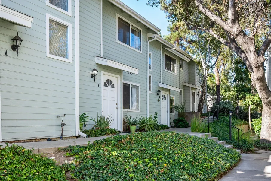 Tucked into the back of Central Plaza - a darling storybook complex of 16 Cape Cod style attached residences is this refreshed two-story home! Just beyond the private grassy courtyard, this 2 bedroom, 1.5 bathroom townhouse includes a private balcony and patio with views over the serene hillside behind filled with oaks, native plants and wildlife. A canopy of trees create an archway above the path to the front door, leading to a lovely living room with LVP flooring and understairs storage niche next to the convenient half bathroom with custom tile backsplash. Moving deeper into the home, find the dining area with a sliding door to the private back patio with room for barbeque or spa, bordering open space. Adjacent to the dining area is the updated kitchen with quartz counters, breakfast ... bar, farmhouse sink, new flooring and paint, gas stove, pantry and a garden window showcasing a re...