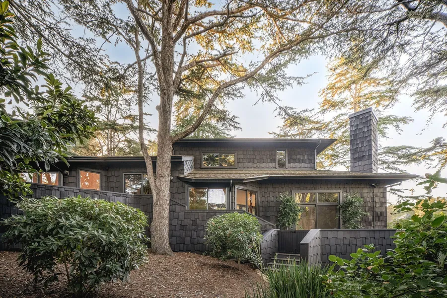 Situated among Montecito's distinguished estates, this striking wood-and-glass residence offers a private sanctuary amid the conifers. Designed by noted architect Don Pederson and updated by designer Lee Stanton, the home features dramatic two-story ceilings and expansive picture windows that invite the outdoors in, creating the feeling of living within the surrounding gardens. An open kitchen and family room anchor the home, with a serene primary suite below and two guest rooms above. A sunken living room and flexible den add mid-century charm and versatility. With an expansive deck, oversized two-car garage, circular drive, and a peaceful wooded setting near Montecito's Upper and Lower Villages, this home beautifully blends architectural distinction with natural tranquility.