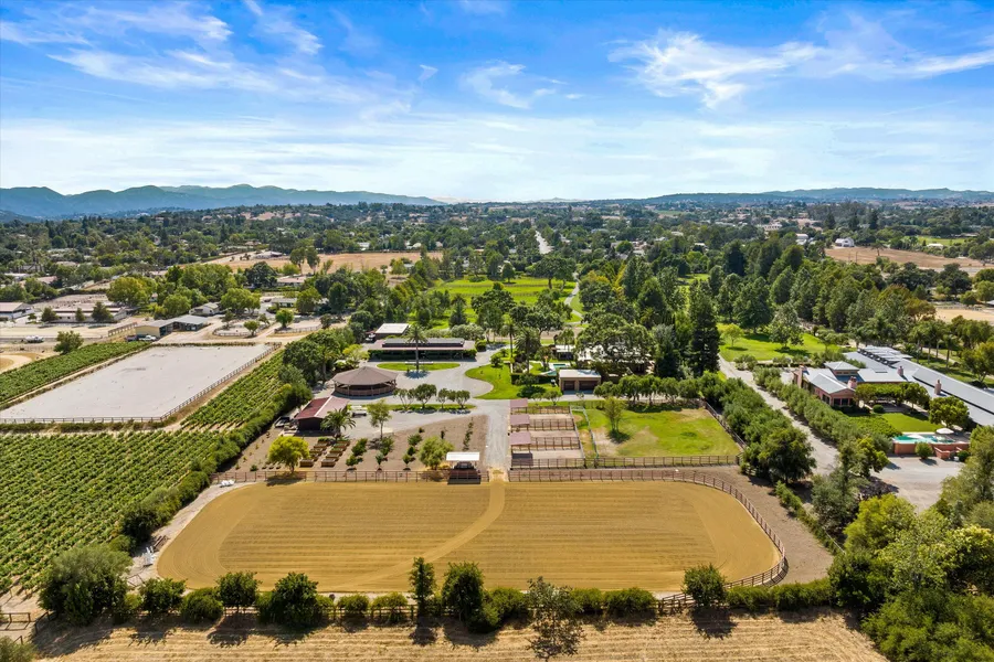 Through the courtyard a stately wooden door invites you into one of the finest equestrian facilities to come on the market in years. The equestrian portion of the property features a 6-stall barn, 5 large grass pastures, three 44 by 33 dry pens with cover, a 125 by 290 arena with a raised & covered viewing stand, a second 66 by 132 short court dressage arena, covered round pen, two large work sheds and plenty of room for the maneuvering and storage of horse trailers. Attached to the barn is a fully-equipped 1,000 sf, 2 bedroom, 1 bath guesthouse that includes a kitchen, office, and laundry. One of the most special features of the property is a newly constructed 627 sf custom home theater featuring a 150 screen, and the latest AV equipment, sound deadening, and light blocking systems.