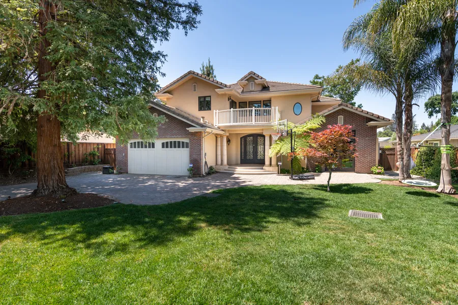 Newly built in 2007, and extensively remodeled since then, this classic home is perfectly located just one block from all the amenities in the Village. Towering redwoods and a paver stone driveway precede the architecturally beautiful front entrance where four columns support a large balcony that extends from the upstairs primary suite. A marble foyer, also with architectural columns, introduces the expansive living and dining room combination that opens to the kitchen at one end and includes a full bar at the opposite end. The kitchen has been entirely remodeled in a white palette with quartz counters and high-end stainless steel appliances. The open concept continues into a large family room with added custom cabinetry for media needs and French doors to the rear grounds. There is a dedicated office perfect for todays work-from-home needs plus a main-level bedroom suite that is ideal for guests or a second office, if needed. Upstairs, three additional bedrooms include the luxurious primary suite and two bedrooms, each with an en suite bathroom. Completing this premier home is the spacious and private rear yard, extensively landscaped with a large patio that shares the living rooms fireplace, vast lawn, perimeter gardens, and bountiful fruit trees. With a steps-away location to the Village, access to excellent Los Altos schools, plus like-new finishes, this is an excellent place to call home.