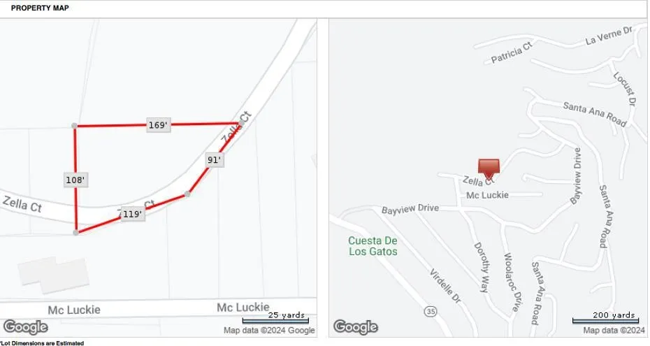 Your opportunity to own a piece of heaven. Private lot with approximately 14,810 sq ft nestled in the Los Gatos Mountains surrounded by beautiful Redwood trees. Four lots available. Three under APN 544-47-022 with 14,810 sq ft and one under APN 544-47-024 with 5,227 sq ft under separate listing. Would like to sell all three together. PG&E power at street. Short drive to shopping, restaurants, entertainment, and beach in nearby towns, including San Jose, Los Gatos, Scotts Valley, and Santa Cruz. Quick, easy access to Summit Rd and Highway 17. CA17 going toward Santa Cruz Take Summit Rd Exit Turn Left onto CA 35/Summit Rd Turn Right onto CA-35 Slight Right onto Woolaroc Dr Continue Straight onto Virdelle Dr Sharp Right onto Bayview Dr Turn Left onto Fern Ave Turn Right onto Zella Ct MY SIGNS ARE ON ZELLA CT ON THE LEFT SIDE. IF YOU HAVE GONE TO THE HOUSE ON THE LEFT THEN YOU WENT TOO FAR.