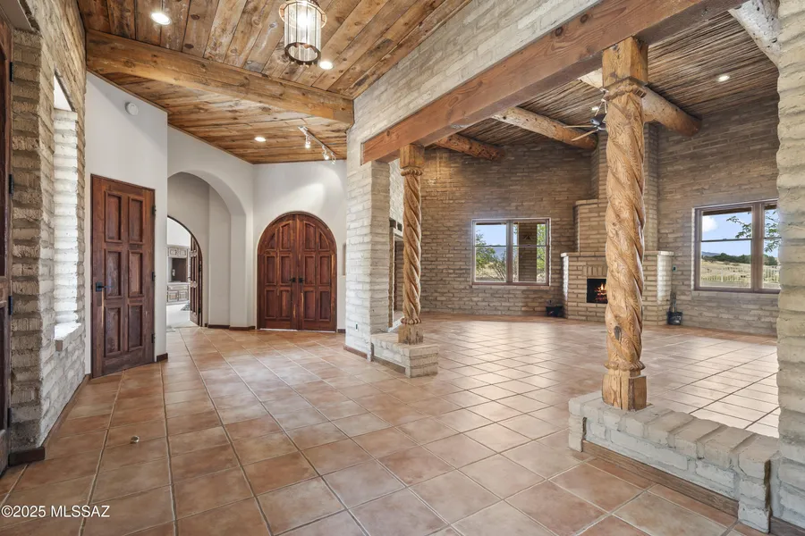 STUNNING Authentic ''Mud Adobe' Hacienda w/Striking features throughout. Built on 12'' torsion bar tension slab w/16'' adobe ext. walls. Great Rm w/ High saguaro ribbed ceilings, 16'' hand hewn viga beams, 2 fireplaces & built-in wet bar. Chef's kitchen boasts Granite island, prep sink, commercial grade appliances, Sub Zero Refrig., Viking dual gas stove, double ovens, Antique cook stove & solid Mesquite wood flooring. Marble counters tops in R/R, walk-in shower & Huge walk-thru closet. Home office w/hand peeled latillas ceiling & solid mesquite flooring w/solid wood doors. Custom built 42x52 4 door block SHOP w/ RV bay, work counters. Great private well w/new pump/pressure tank put in 2024. New Int. paint in primary suite, Roof warranty at home & shop. Amazing MTN views, u/g power, Wow