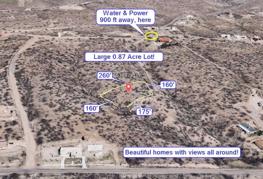 Large 0.87 acre elevated building lot at 638 Flag Ln with water and power 900 ft away on Calle Tubatana, no HOA and not in a flood zone, with gorgeous views of nearby mountains and rolling hills in a developing neighborhood. This property is 3 miles to Interstate 19 and amenities including Walmart, banking, groceries and gas. Its 60 miles to Tucson (1 hr drive), 20 miles to beautiful Patagonia Lake for fishing, boating, hiking and recreation and there is plenty of outdoor life and wilderness to explore with mountain ranges nearby being as high as 5,600 ft! The elevation of the Rio Rico Southwest is 3,481 ft, making for pleasant year-round weather that is usually 15-20 degrees cooler than Phoenix. Get this property today and realize instant equity, hold for investment, or build your dream home!