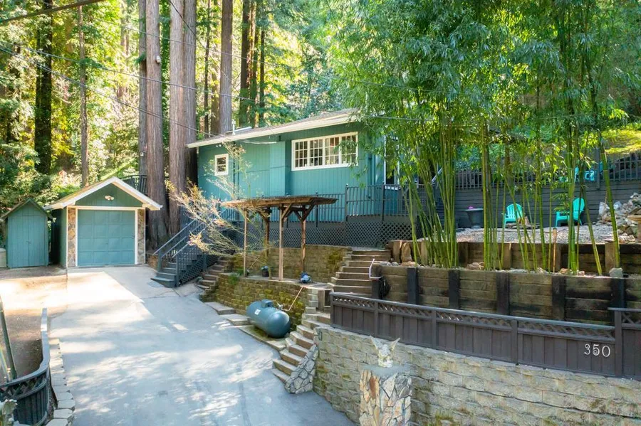 Cool contemporary vibe! Flagstone pillars & friendly gargoyles flank the entrance to this sophisticated mountain home. Updated in 2019 w/lite & bright granite & stainless kitchen & new bath. Brand new int/ext paint & LR carpet make this house sparkle. Vaulted ceilings & spiral staircase accent the large loft & add drama to the airy LR. So many extras: Walk-in closet in MBR, inside laundry, pantry, skylite, FA gas furnace, NUVO water filtration system, copper piping, generator hookup. Awesome set up for outdoor living with 2 huge decks & cozy firepit area. No septic failure worries here, engineered MICROFAST waste disposal system installed in 1999 will last a lifetime per Coastal Septic. Detached garage, storage building, Tuff shed. On site parking for 4 cars, plus room for boat or RV. Great commute location for a quick trip to Silicon Valley or easy access to Boulder Creek and down valley.