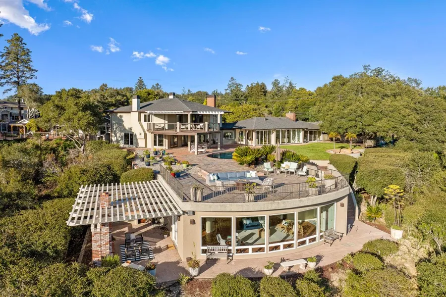 Behind the gates of this private estate, you will enjoy an entertainers dream home, matched with unparalleled views of the city, the ocean, and Pogonips rolling hills. As you walk through the front door you are immediately immersed in beauty; warm hardwood floors, expansive living and dining areas, and a striking wall of windows brings the spectacular views right to you. The sprawling first floor features two spacious bedrooms, two bathrooms, and a chefs kitchen with commercial-style range and a built-in breakfast nook overlooking the pool and the Monterey Bay. The second living room features another fireplace, and elegant wooden cabinetry frames the dream bar and adjoining wine room. Upstairs, the primary suite is a true retreat, boasting a generous bedroom, a spa-like bathroom, two walk-in closets, a private library with fireplace, and a private deck with views across the bay to Monter...
