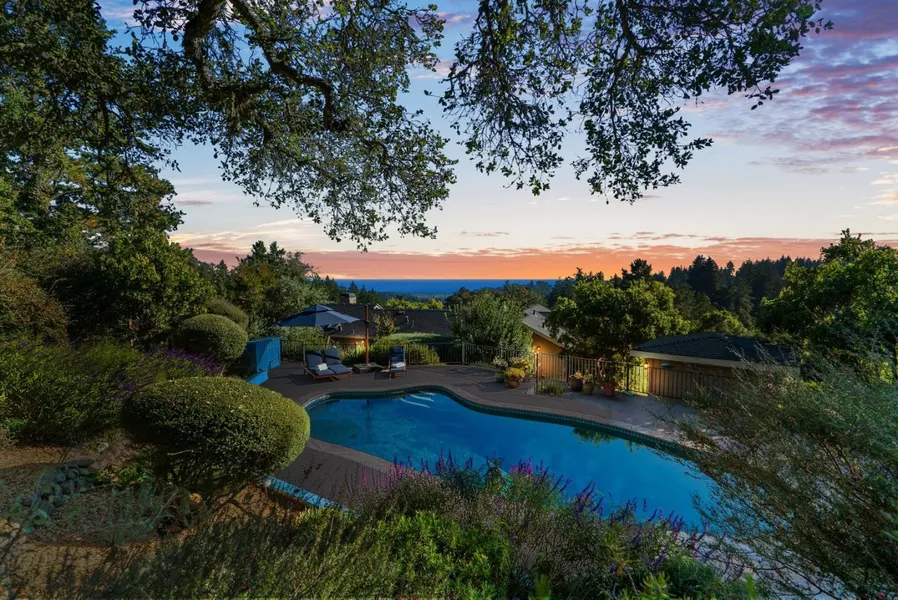 Panoramic Ocean Views from Santa Cruz to Monterey from this stunning hilltop home. As soon as you reach the top of Oak Acres you won't want to leave, but the views are just the beginning. Enter through the custom front door to high ceilings, an open floor plan and rooms with some of the most beautiful views in Santa Cruz. You'll enjoy the large 4 bedrooms, three with en-suite bathrooms, a stunning chef's kitchen with butler's pantry, refinished Cherry wood cabinets, 6-burner BlueStar oven/stove, Thermador hood, and skylight. Two large dining areas and large living room, laundry room and office all on the first level. Downstairs you'll find the large bonus space/den that is currently being used as a movie room and includes a kitchenette, bathroom and private entry great for guests or multi-generational living. This property has over 5 acres, but within the 2 fenced acres you'll enjoy a beautiful swimming pool with large surrounding deck, outdoor kitchen area, spa, tree house, chicken coup, fruit trees and so much room to play or garden. Multiple patios and outdoor space to soak in the sun and enjoy this gorgeous property. 2-car garage and room for storage are just the icing on the cake. Easy access to Hwy 17, great commute location and close to town.