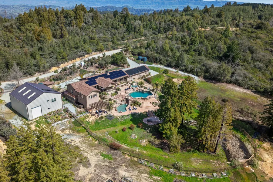 More than a house, a retreat— upon 15+/- acres with sweeping Monterey Bay views. No expense was spared in creating this property. Electronic gated entry opens to a courtyard where water sculpture by Los Gatos's Tony Lynott sets a harmonious tone of luxury in nature. 2500 square foot, single-level living with views from every room, PLUS 2500 square feet of unconditioned space beneath the home with 12 foot ceilings— create whatever you envision! $1M foundation. Permitted 48x48 two-story warehouse with dual roll-up doors, loft, and second gated entry. 400-amp three-phase PGE service, solar powered home and warehouse. Built with high-quality materials, from Brazilian granite countertops to bamboo cabinetry and marble floors. Primary suite is a private sanctuary with ocean views, sauna, and steam shower. Two guest rooms, one an en-suite, open to views. A spa for 10 flows into the pool, and from there a waterslide into a second pool! Pentair pool tech. Home and outdoor living area protected by 6 foot steel fence complete with gates for tractor or other access. Flat land with pre-dev. for 1200 square foot ADU with 400 square foot loft just needs code updates. Lutron lighting, multi-zone heat and A/C, hardwired alarm, Cummins generator, transfer switch, battery backup. five-car garage, plus large parking area. Private Mount Madonna preschool-12 nearby.