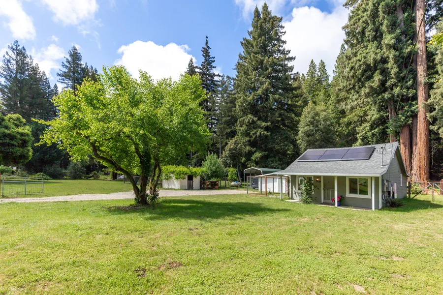 This rare gem in the Santa Cruz Mountains sits on over 1 acre of flat, sun-drenched land. The walk down to the small creek in the backyard offers a wonderland of natural beauty and flat spots for reading, yoga, or meditating. The lovingly maintained home features new floors, an open-plan kitchen, vaulted open-beam ceilings, and sun-drenched windows throughout. The bedroom's location on the ground level means there's no need for stairs to access the kitchen or bath. The small, bonus loft upstairs allows for additional storage, an office, or a guest sleeping area. The private back patio off the kitchen includes covered access to the laundry room and a covered hot tub for a relaxing soak after work or play. The sunny grounds feature a fully enclosed vegetable garden, a fruit orchard, and plenty of room for outdoor hobbies, dining, or entertaining. Sun-lovers rejoice! In the garage, you'll discover a workshop area with copious shelving and space for gardening supplies, DIY hobbies, and extra storage. This is a rare opportunity to own a move-in-ready home with generous land and natural beauty, less than 30 minutes to hiking, biking trails, golfing, and world-class wineries. Just 1 hour to Silicon Valley and 1 hour to the beach in Santa Cruz.