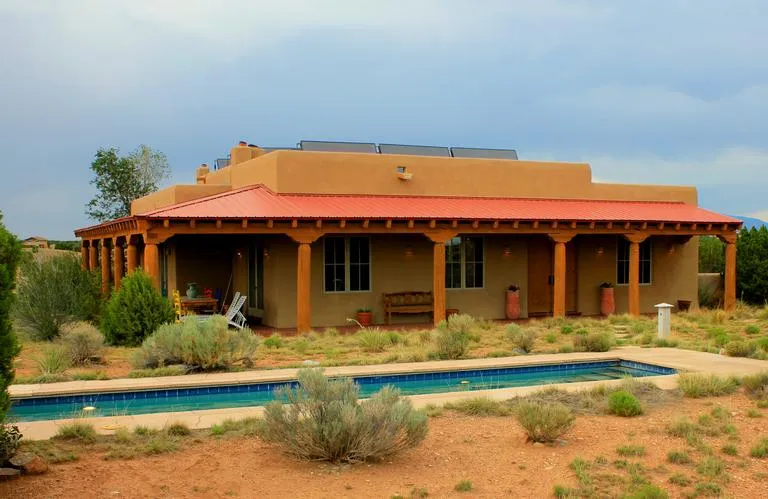 Beautifully located with unobstructed views of the Ortiz Mountains. Constructed of 2ft thick poured pumice with diamond-finish plaster through-out. This elegant home features high coved ceilings, vigas, beams and corbels. The windows are deep set with flagstone ledges. The spacious living room opens to an outdoor patio and a formal dining room. Dramatic archway leads to a butler's pantry and wet bar perfect entertaining with ease. Granite counters tops and a stainless 6 burner range with grill set this kitchen apart with style and functionality. For more private casual dining a kitchen doorway leads to an enclosed courtyard. The estate includes a charming 1 bedroom 1 bath guesthouse with kiva fireplace, and tennis court. What could be more enjoyable than to cool down during the day or relax and stargaze at night from the heated lap pool. This is southwest living at its best.