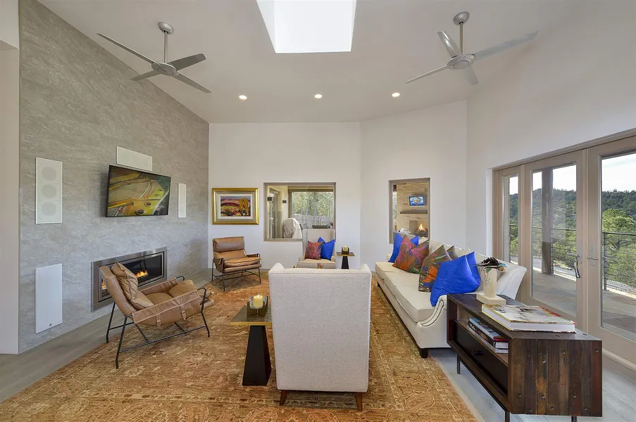 Extraordinary 5 bedroom 4.5 bath contemporary Pueblo style home and guest house on 12 acres in the exclusive Wilderness Gate subdivision, backed up against national forest on two sides of the property. A wide foyer leads into open living and dining areas with high ceilings and patio doors to a flagstone portal with stone fireplace with mountain and wilderness views. A stylish gourmet kitchen is appointed with a center island, double oven, 5-burner cooktop, Bosch dishwasher, under counter microwave and wine cooler plus a separate breakfast area. Split bedroom floorplan. The luxurious master suite has a fireplace and a spa-like bath with soaking tub, steam shower, heated towel racks, powder room and dual walk-in closets. With generous wall space everywhere, this is a home that art collectors will enjoy. There is a detached studio with plentiful light for artistic pursuits. A separate Pueblo traditional style 1,280 sq. ft. guest house has 2 bedrooms, full kitchen, living area, bath and deck surrounded by trees. An excellent property for reunions, large scale entertaining and outdoor living and dining. Green features include Bosch geothermal heat/cooling, solar voltaic electricity (26 solar panels), rainwater and greywater harvesting for garden irrigation, Energy Star appliances, low flow fixtures. The Wilderness Gate community is located between the historic Eastside and the Santa Fe National Forest. Direct access to numerous trailsall within 5 miles from downtown.