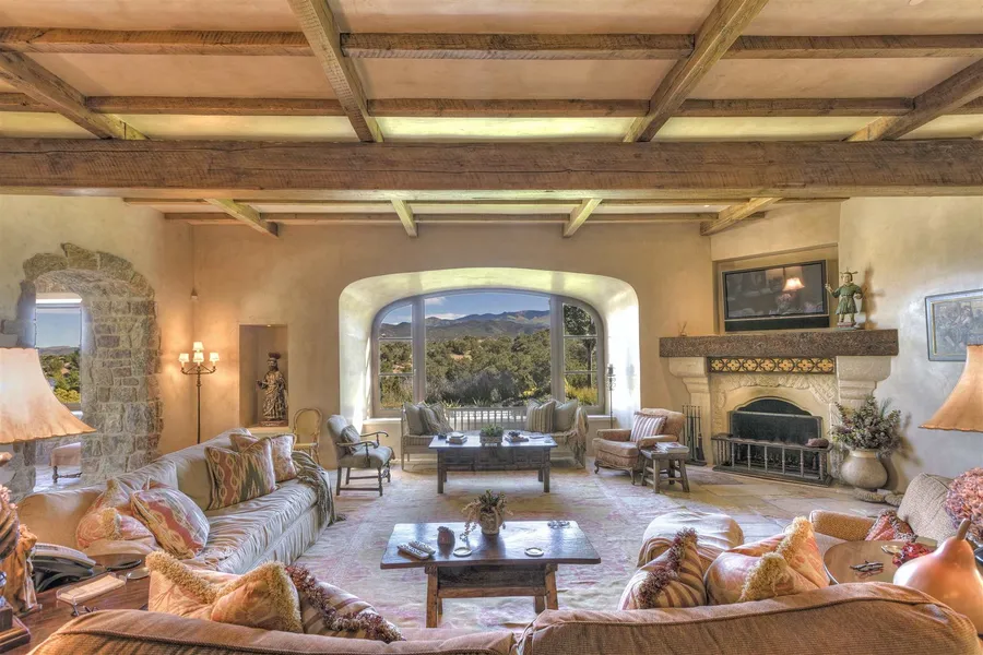 Exceptional 6 bedroom 7 bath custom-designed and built residence and guesthouse expertly sited on over 16 acres in the prestigious gated community of Tesuque Ridge Ranch. Includes 2 adjacent parcels, each over 5 acres. An air of grandeur pervades the nearly 14,000-square-foot manor, yet every space is warm and welcoming. The heart of the home is a generous kitchen and den with a fireplace, a breakfast area, an adjoining portal, and an awe-inspiring view of the Sangre de Cristo mountains. The thoughtful design includes magnificent formal living and dining rooms, a handsome library, and private bedroom wings for owners and guests. Surfaces of lustrous plaster and cool antique Jerusalem stone contribute to the regal ambience, while earthy reclaimed walnut, hickory, and mesquite add warmth and depth. A third-generation German stonemason crafted mantels for the homes 13 fireplaces. Enveloping...