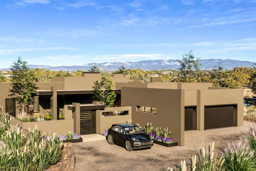 Exciting opportunity to own a contemporary masterpiece, and be a part of the process from the ground up. Designed, permitted, and ready for construction - this Dressel Construction gem features enormous views of all of Santa Fes surrounding mountains. This rare home site embraces the Sangre de Cristo mountains to the east, the Sandia and Jemez mountains to the south, and finally a big view of the Jemez Mountains to the west. This one level home is comprised of 3 bedrooms and a study, but it can be expanded to include a spacious guest house - and even a swimming pool. The floor plan is open, and flows from the well-endowed kitchen (Wolf, Sub-Zero appliance package) to an intimate wine bar for entertainment, and a vast living room/dining room surrounded by sliding glass walls that let the magnificent views in from all parts of the home. The virtual photos catch only a glimpse of the Rad Ac...