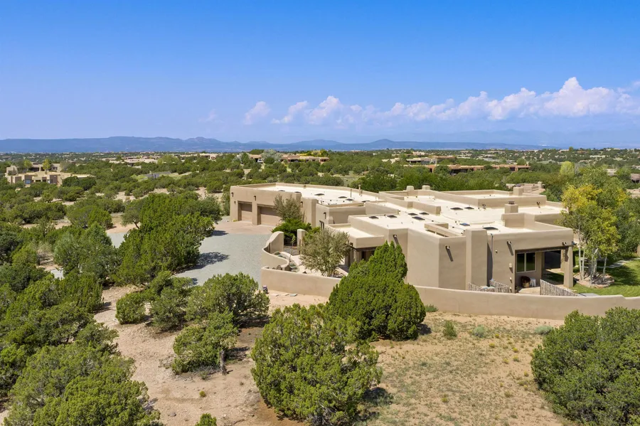 This Santa Fe home has charm throughout and spaces that exude a timeless elegance. A gracious entry leads into the living space that offers many options to entertain indoors or out through the large glass walls with mountain views and patio doors that lead to multiple seating areas, outdoor fireplace and a hot tub to enjoy the Sangre de Cristo views in. Two grass areas and multiple covered patios offer ample outdoor space for gatherings and is great for children or pets. The heart of this home is the well-appointed chefs kitchen with a large island and enough space for guests to enjoy with access to both a formal dining room and a breakfast area with a kiva fireplace and access to additional outdoor dining. Enjoy the private owners suite with a cozy fireplace for cool winter nights and outdoor patio access for warm summer evenings. Separate vanities, soaking tub, walk-in shower and 2 oversized closets and outdoor access. A pleasant surprise is the gracious home office with built-in desk, cabinets and bookcases and direct outdoor entry. The guest wing of the home features two en-suite guest bedrooms, 2 large storage rooms with wine storage and an oversized 3 car garage with plenty of storage for all your toys. This exquisite home is ready to be yours!