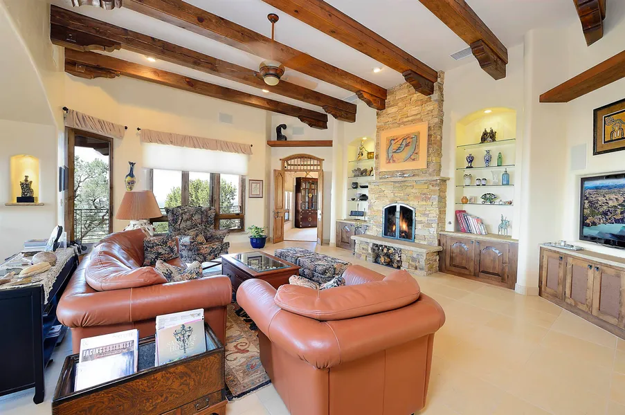 Unique, no steps, single level 3 bedroom 3.5 bath custom-designed home on panoramic ridgetop location with fantastic, 100-mile views of the Sandia, Jemez, Ortiz, Sangre De Cristo mountains and night time Santa Fe city lights. High-end appointments and finishes throughout, including limestone floors, plaster walls, custom beams & vigas, cove ceilings in bedrooms and kitchen, granite and marble countertops, full house sound system, 5 fireplaces (1 on portal) with log-lighters and custom-made flagstone hearths/mantles/sills. Spacious great room with built-in cabinets and lighted nichos with glass shelving for art. Formal dining room with access to outside patio. Impressive gourmet kitchen appointed with custom cabinets, Thermador French door refrigerator, 4 burner stove plus grill, warming drawer, Sub-Zero wine chiller, and large center island. Oenophiles will enjoy the fabulous 750 bottle ...