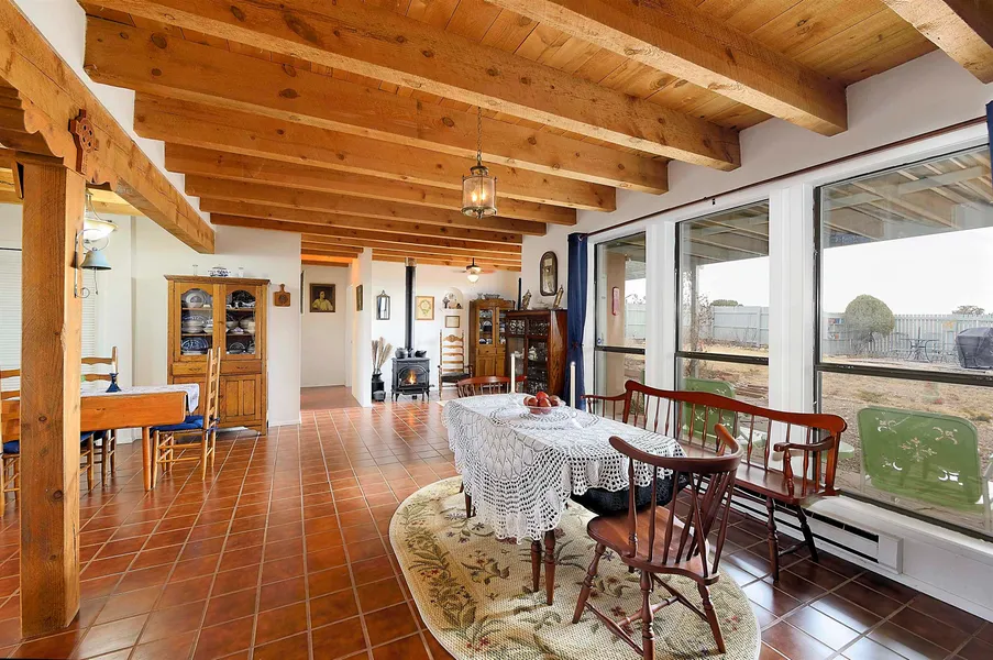 This passive solar 3 bedroom 3 bath Pueblo style home on 1.21 acres in the sought after Eldorado area. Flexible, open floor plan with two living areas and classic white kitchen with Corian countertops and stainless-steel appliances. Split bedroom design with spacious master bath with jetted tub and large walk-in closet. Adjacent to the master is a separate studio/office. Guest bathroom was remodeled in 2020 and includes hand-painted tile and walk-in shower. Brick, tile and Saltillo throughout. New mini splits in kitchen and family area in 2019. Solar panels were installed in 2021. Landscaped fenced-in backyard and river rock landscaping in front. Eldorado with its wide-open spaces, beautiful mountain views, spectacular sunsets and night sky, is approximately 20 minutes from the Santa Fe Plaza. There is a strong sense of community at the Eldorados Community Center, the Eldorado Community School (public K-8), Vista Grande Public Library and the Adams Senior Center. Eldorado amenities include hike/bike trails, greenbelts, clubhouse, swimming pool, tennis and basketball courts, soccer fields, a dog park, stables and a 4,000-acre conservation area for hiking, biking and horseback riding.