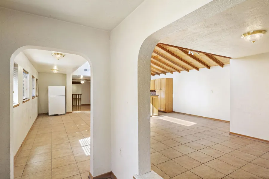 See this spectacular setting for this charming Northern New Mexico pitched roof home on 2 acres at the end of a lane in a private setting with a stream along the bottom of the property. The great room is open and bright with beams and a T&G ceiling open to the Kitchen, Dining, Den and adjacent to the living room. There is a long portal on the front to enjoy the Bosque with giant old cottonwood trees, which are spectacular in the Fall when they turn a stunning golden color. A sizeable primary bedroom with a 3/4 bath and a huge closet. There is also a smaller bedroom that could be an office adjacent to an open area that could be a library or a studio/craft/art space, and these are just some of the features. There is a walk-in Tub in a hall bathroom, an extended deck on the Northside of the home to enjoy in the Summer months, and a new private Well. There is also lots of space for your recreational vehicles--RV, Boat or other fun toys. Make your appointment today to see this lovely property for sale.