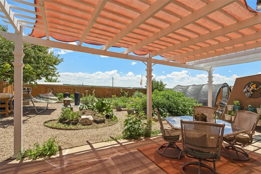 True Gardener's Delight with room for everyone! CHECK OUT THE 3D VIDEO. This single-level Northern New Mexico La Paz at Eldorado property has gorgeous gardens with an amazing raspberry patch, hoop house, apple and apricot trees and raised beds. Exceptionally open floorplan with one of the largest great rooms in the neighborhood. Custom kitchen has stainless appliances, custom cabinetry, granite counters, island with storage and generous pantry space. Attached 1,200 sq. ft. single-level casita/studio has 2-bedrooms, full bath, kitchen (no stove), living room, sunroom and a private courtyard. Primary bedroom has foothill views, double sinks, two shower heads and just steps to the hot tub. Library has built-in shelving and a window seat with storage. Pitched metal low-maintenance pro-panel roof with de-icing cables. Real refrigerated air conditioning. Two 1,750 gallon cisterns with pumps for garden and landscape watering. Property is nearly all on a drip including outside the walls. Greywater from washer waters the trees. Solar panels - 4.83 kW PV - on garage roof. HOA approved and fenced RV storage (16' x 42'). Recirculating hot water. A real finished 3-car garage. Paved driveway and paved road. Attic and garage ceilings have 16" of insulation. Shed conveys. Bocce ball court. Most of the furniture, including the 50" TV in the casita, stays with the property at no charge to buyer. NO STEPS.