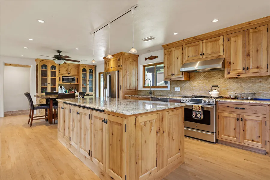 Right next to La Mesita, a serene spot down a country lane, welcome home to this horse property with proper facilities, extremely comfortable house and a lush ample yard for animals and farming. The fully fenced and gated property borders the Pojoaque Pueblo farm land creating more privacy than a normal 2 acres lot. The views of the Barrancas from the backyard are exceptional. The mostly adobe home with hardwood and tile throughout has a fabulous kitchen with a large island and high end appliances. The kitchen sits between the den, dining room and great room yielding great flow for entertaining and living. The formerly attached casita has been upgraded to create a mud room with a separate entrance and a new owners suite and bathroom. On the other side of the house are two bedrooms, an office with floor to ceiling book cases, and two full baths. The barn has two stalls, hay storage and a ...