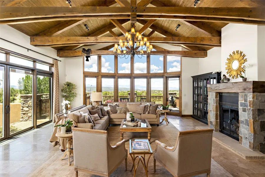 Located on a 1.6 acre site in the private and gated Estancias neighborhood of Las Campanas, this boldly crafted Roger Hunter home exhibits a distinctly grand and dramatic character. Surrounded by expansive views of the western Jemez mountains, the main living areas are replete with picture floor to ceiling windows to capture the landscape and the spectacular Santa Fe Sunsets. Vaulted ceilings with exposed square cut beams, tile and hardwood floors, wooden lintels are just some of the luxurious custom finishes that demonstrate not only distinctive design, but a home intended to synchronize with the surrounding natural grandeur. This imposing 3-bedroom/5-bathroom home is anchored by an entrance rotunda crowned with a radial beamed ceiling and clerestory windows that serves as the nexus to the three wings of the house. One corridor leads to the luxurious master suite with two large bathrooms, two walk-in closets, gas fireplace, office, and exercise room. A second wing accommodates the two guest suites, each with a designated private patio, ensuite bath and walk-in closet. The third branch advances to a beautifully equipped kitchen with Viking appliances, granite countertops and a large central island, to a dining room, a pantry, a media/reading room, a wine storage room, and exterior portal that centers leisure and entertainment activity around a large wood-burning fireplace. Two laundry rooms and a 3-car attached garage complete the picture. Truly an exceptional property offering comfort, security, and sumptuous living to the luxury buyer.