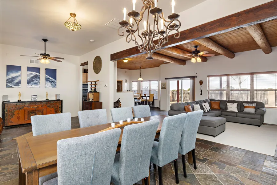 Handsome, soft contemporary home on four acres in Terra Colinas with slate floors, high wood ceilings and vigas. The sleek, updated kitchen with granite countertops opens to a spacious living/dining area and the sliding glass door leads to the rear courtyard offering extensive southern and western vistas. The owner's suite has a gracious bathroom and walk-in closet. There is nice separation of space between bedrooms and narrow lofty windows in each bedroom bringing in plenty of light and air circulation. Off the kitchen is a generous laundry room with storage. Recently maintained roof and stucco. Completely surrounded by enclosed, treed yards with a storage shed this private, gated getaway is move-in ready!