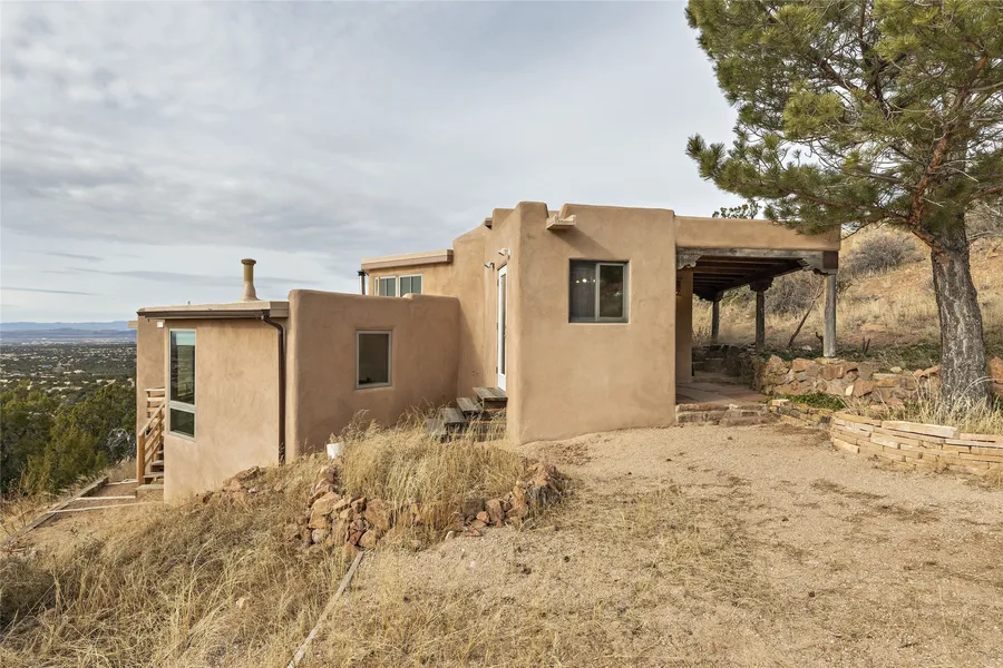 Million dollar views from this unique property! Positioned on an elevated lot, soak in unparalleled views of every mountain range to the south and west, & endless NM sunsets. This property would work well for an artist or a 2nd home, offering lots of Santa Fe charm & an inspiring space to create your work of art. The craftsmanship & detail, like no other, is impressive. Detailed wood finishes with inlayed turquoise from the Tiffany mine in Cerrillos, diamond finished plaster walls, & areas of flagstone & wood floors. The living room has a cozy wood burning stove, as well as classic traditional Vigas. Flexible floor plan may be used as 3 bedroom spaces, either 1 or 2 bedroom spaces, studies/studios/etc. Seller used as a 3 bedroom - a few spaces dont have standard closets attached. Upstairs loft/bedroom with lots of natural light. The southwest side of the home features the kitchen & dining area, with floor to ceiling windows to take in the incredible mountain & sunset views. Classic wood ceiling panels in the kitchen/dining space, as well as ample storage and countertop areas in the kitchen. Full bath down the hallway, adjacent to the living room. A small deck is located off the dining room, with stairs that lead to the mechanical room & washer/dryer. Front entry has a large closet, & mudroom space. There is a secondary space previously cleared for a casita or studio, south of the main home, should you choose to expand. Loads of possibilities to make this property yours.