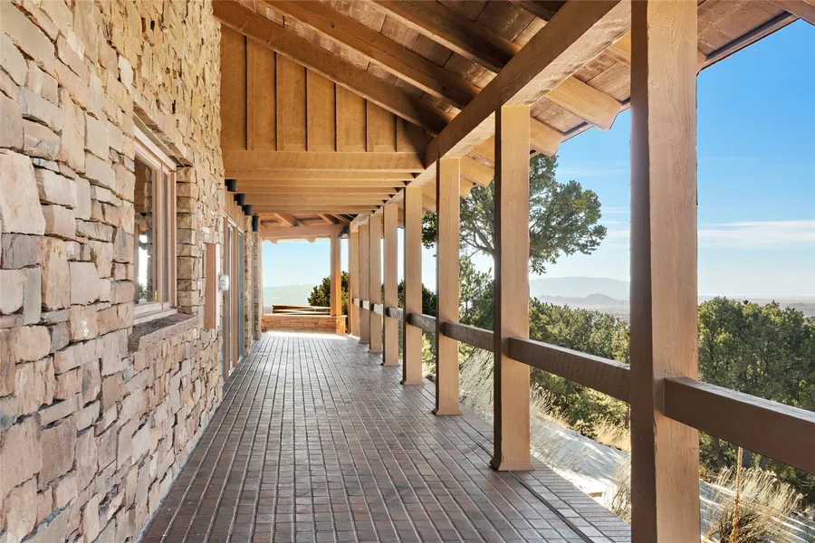OASIS IN THE SKY. Perched by the top of the Santa Fe Summit and privately held by one family for over 30 years, this iconic property is comprised of 14+ acres with a driveway that winds up and arrives to a private estate with astonishing views in all directions - and from every room. Ever wonder what is behind the stately gates of this private and sequestered property? A feeling of peace and tranquility - as if you live in a national forest of your very own! Ideally located just 8 minutes from town and so very close to Ten Thousand Waves Spa, Izanami restaurant and the Ski Basin! Absolutely unique one-of-a-kind single level house (except for home tender suite) maximizes the views from every vantage point and allows you to entertain with style indoors and out. Large living entertaining area is surrounded by bedroom suites that fan off from central social room with excellent storage throug...