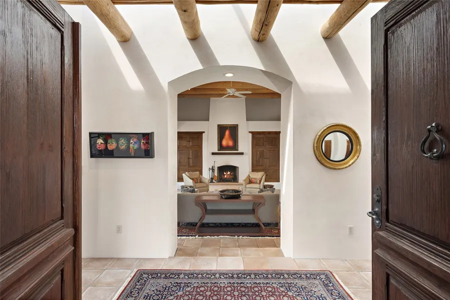 Enjoying views of the serene high desert landscape and majestic mountains to the east and west, this three-bedroom single-level residence on an elevated lot in the exclusive community of Las Campanas is a rare jewel with plaster walls, soaring ceilings, and abundant natural light. The elegant, spacious floor plan features a cook's kitchen with stone and quartz countertops, stainless-steel appliances, and a sunny breakfast nook; a formal dining area; and a cozy living room with a fireplace and a wall of windows that showcase the breathtaking scenery. The owner's suite is a true retreat with a walk-in closet, a spa-like bath, and a private portal perfect for relaxing and enjoying sunset vistas. The two additional bedrooms are also generous in size and feature views and en suite baths. The outdoor living space is equally impressive, with three portales and courtyards that offer unique perspectives of the stunning surroundings. The backyard is beautifully landscaped with native plants and flowers and offers ample room for entertaining and gardening. The property benefits from a central location in coveted Las Campanas, which offers 24-hour security and amenities for club members that include golf, tennis, a fitness center, a spa, an equestrian center, and fine dining. The new owner will also appreciate the proximity to downtown Santa Fe, with its rich culture, history, and art. This property is a rare opportunity to own an easy lock-and-leave piece of paradise in one of the most desirable locations in New Mexico.