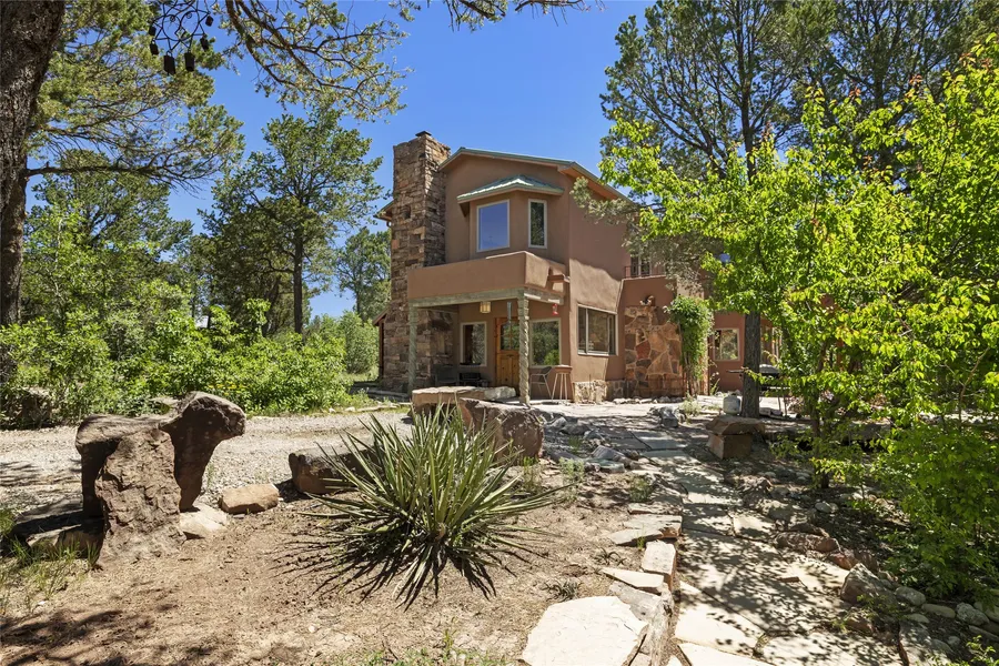 Truly picturesque gated mountain retreat - all just 20 minutes from Santa Fe. With the traditional southwest charm of vigas, corbels, beams, and arches, this artistic home and separate casita are surrounded by beautiful pine forest. Incredible views including Rowe Mesa, Glorieta Baldy, Pecos Wilderness, and two miles to Pecos National Monument. There are 3 bedrooms, 2 baths + office in the main home. Adjacent to the entry is a cozy sitting area with a wood burning fireplace, just one of many unique features found throughout. The kitchen is spacious and open with a center island, propane cooktop, and electric double ovens. With abundant natural light throughout, the dining room & living area are spacious and ideal for entertaining. French doors lead to the outdoor flagstone covered patio. A beautifully appointed guest bath with large jetted tub is downstairs, as well as a large laundry room and storage area. Two separate staircases, one with a loft & cozy sitting area, lead to 3 bedrooms. The primary bedroom features a small atrium and outdoor balcony. A study adjoins this bedroom and could be converted to a spacious primary bath. The one bedroom & bath casita is a nice distance away from the main home, offering tranquil privacy. A large two story workshop (approximately 638 sq. ft) and chicken coop, as well as a two car covered carport, and many serene outdoor spaces are yours to enjoy on this 9 acre lot. Check out the 3D tour of both the main home and casita!