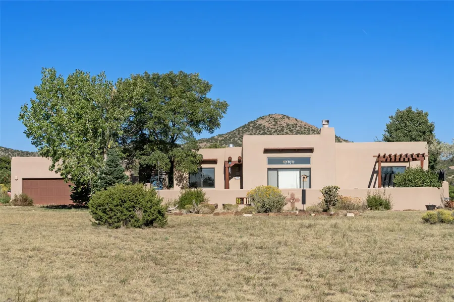 Beautiful Eldorado home where you can stargaze from the hot tub, park your RV and listen to the quaking of the happy Aspen trees. Plaster finish in most of the house with nichos. Kitchen has double ovens, convection microwave, large deep sink, pantry and extra work area. In-floor, natural gas radiant heat tubing is Pex - photo in supplements - domestic supply is copper. Oversized and heated 800+ square-foot 2-car garage. There are two kiva fireplaces, one in the dining room and one in the living room which have electric inserts which can be easily removed to make them woodburning. Walled front courtyard and fully fenced backyard both on drip irrigation. New boiler in January 2023, all stainless kitchen appliances are less than 4 years old. Recent roof maintenance. Water heater new in 2018. Hot tub has new top Sept. 2023. Media room could be third bedroom. One step down into mudroom. ECIA approved RV parking with cover to match stucco. New shed. Mountain and Galisteo Basin views. Rain barrels, extra fridge in mudroom, outdoor heater on back patio and all garage shelving convey with the property. NO KITEC, NO CARPET. Lot corners are flagged. Close to shopping and easy access to I25. Seller may need leaseback for up to 90 days.