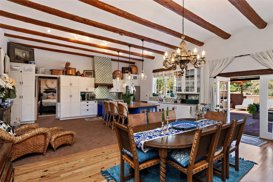 Spectacular Lamy Jewel Box! Adobe Charm Redefined. Quaint yet grand, this 2 bedroom, 2 bathroom home has been expertly renovated and is part of a compound. Every inch has been touched. French doors open from great room to a new backyard patio featuring a wood-burning fireplace, beautiful fountain and covered dining area, creating amazing outdoor entertaining space and extending your home's living area. The property has been newly irrigated and landscaped including cherry, apricot, apple and pear trees and the enormous great room overlooks a grove of 11 mature aspen trees. Brick and Georgia Pine floors have been refinished. High coved viga ceilings, huge windows, an elegant handmade Victorian mantle and fireplace framed by beautiful handmade southwestern floor to ceiling bookshelves add to the remarkable charm of this property. Nestled in the heart of historic Lamy Village, this home feat...