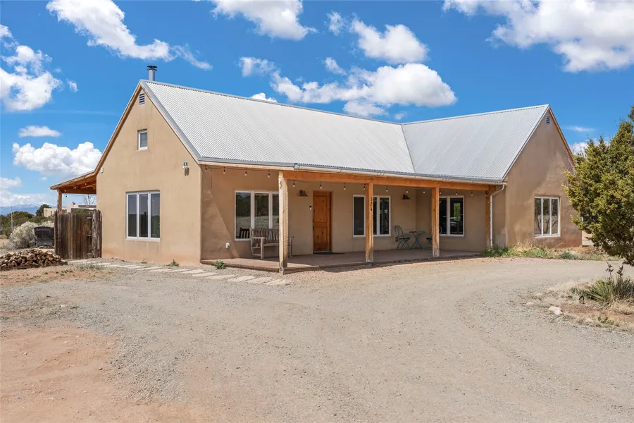 Rare Santa Fe horse property located 15 minutes from the Plaza. Enjoy spectacular Sangre de Cristo views from this northern New Mexico style pitched-roof and AER-block masonry-constructed house and guesthouse. Enter the spacious portal into a warm open floor plan with diamond finished plaster walls, lofty ceilings, and stained concrete floors throughout. The generous ensuite primary bedroom has nice separation of space from the guest bedroom/office and three-quarters bath. From the back portal enjoy views of the Jemez Mountains, the Caja Del Rio Plateau and the Sandia Mountains. The detached guest house has a kitchenette, bath, sleeping loft, portal with views and a private fenced yard. The 2.5 horse friendly acres are located on a high flat meadow with a pipe corral, 12x24 lean-to and a second 12x24 lean-to with attached 12x12 tack room and trailer parking. AER-block construction provid...