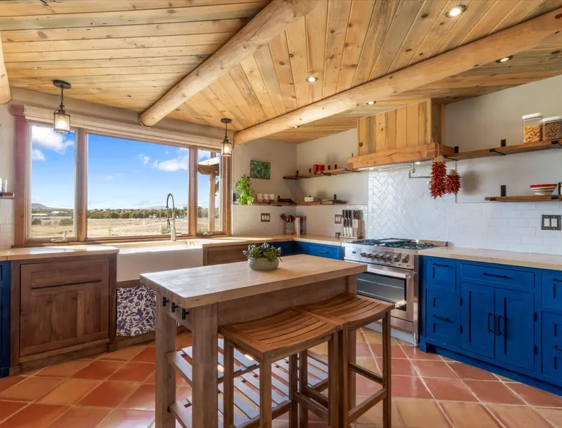 Views, views, views! Nestled on a fully fenced 5-acre lot just south of Santa Fe off the Turquoise Trail, this stunning property offers panoramic vistas of 5 different mountain ranges. The 3-bedroom, 2-bathroom home boasts a spacious open kitchen and living room area, complemented by an additional 500 sq.ft. finished studio/workshop flex space with heating and cooling, easily convertible back to an oversized 2-car garage. This 2300 sq ft hybrid modular home is built on a solid foundation with a stem wall and crawlspace. Key features include a private well with a new pump, a 4-year-old septic system, and a kitchen equipped with a luxurious 5-burner gourmet gas range, custom cabinets, butcher block countertops, and Saltillo tiles. The bathrooms were updated in 2024. Chicken coop. No HOA.