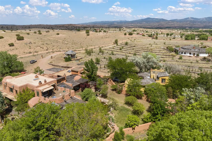 Just 18 miles North of Santa Fe in the pastoral beauty of the Pojoaque Valley, bordering sacred Native American Indian land with grazing buffalos; this 13+ acre estate property offers wide open 360 degree views of the Sangre de Christo and Jemez mountains and an impressive backdrop of the Barrancas badlands. Magnificent 4 bedroom / 4-1/2 bath main residence of architectural splendor, adjacent boutique with separate entrance, a superior 2 bedroom / 3 bath custom built guest house, all together more than 11,000 sqft, plus 8 acre field with water rights and private well.