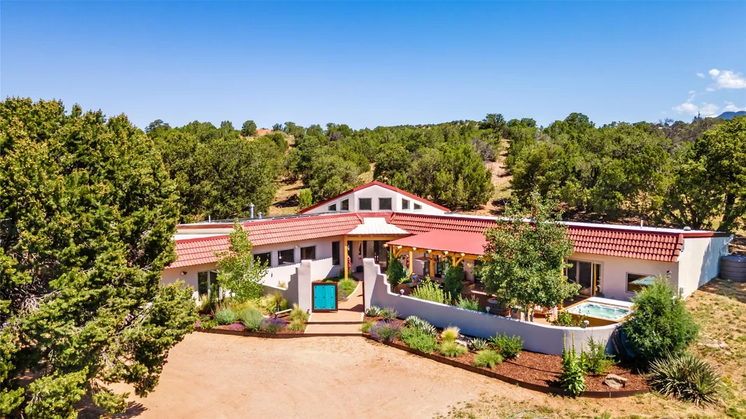 Enchanting hacienda style home in the desirable Sunlit Hills neighborhood in the foothills of the Sangres embodies the essence of Southwestern elegance, a serene 4 bed, 3 bath retreat on a forested 5 acres adorned with mature pi?ons and flourishing peach and pear trees, close proximity to the Rail Trail, hiking trails and equestrian facilities, all a mere 15 minute drive from Downtown. Enter the property through a private walled courtyard with hot and cold spa wrapped in pine decking. Step inside and experience the warmth of this home flooded with natural light from skylights and clerestory windows, enhancing the beauty of viga and beam ceilings in the spacious great room with kiva fireplace. Hosts will love the floor plan with dual primary bedrooms, each providing tranquil spaces with their own kiva fireplace, along with two secondary bedrooms. This passive solar bermed home is sustainably built with solar panels installed in 2022, large water cisterns, a drip irrigation system that irrigates the fruit trees and grandfather pi?on tree, and drought-resistant landscaping in the front yard and courtyard beds. Those that love outdoor living and entertaining will adore the patio and large shaded portal with stylish light fixtures, a dream for dining al fresco and soaking up our legendary sunsets. Additional updates include a gorgeous redesigned primary bedroom closet, a boiler and heating system installed in 2021, and a pro-panel roof installed in 2018. Further features include a 2 car garage, carport and storage shed. With 5 acres, including Sandia views at the top of the property, this space presents a dream for equestrians, hobbyists or artists to build a studio, casita or horse facilities. Whether you seek a permanent residence or a seasonal retreat, this hacienda offers a unique opportunity to embrace Santa Fe living at its finest. Experience its beauty today!